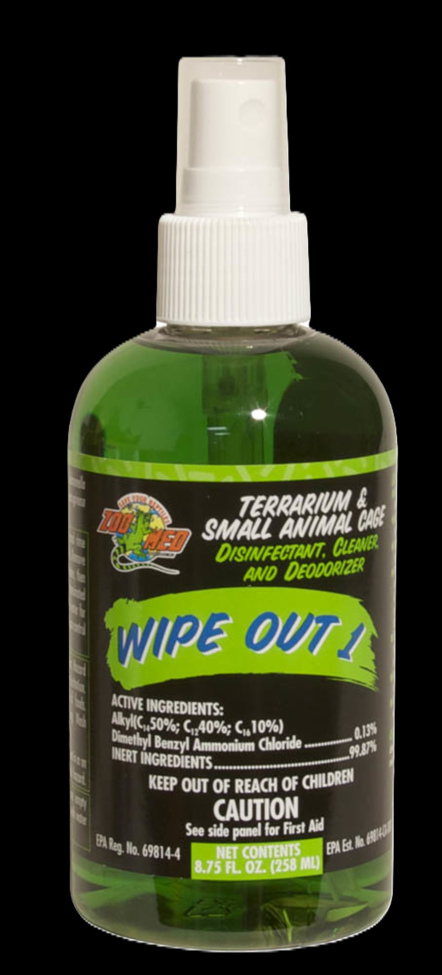 Terrarium and small animal cage disinfectant, cleaner and deodorizer. It is ideal for cleaning, disinfecting and deodorizing terrariums and other animal enclosures. Wipe Out 1 kills Salmonella choleraesis and Pseudomonas aeruginosa and can reduce the spread of bacterial infections among your animals.